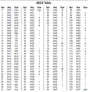 ASCII Tablosu Hex-Dec Dönüşüm Yazının yazarı Tasarlayan: Mustafa AYDIN Yazı tarihi 12 Ocak 2018 Yorum yok ASCII Tablosu Hex-Dec Dönüşüm